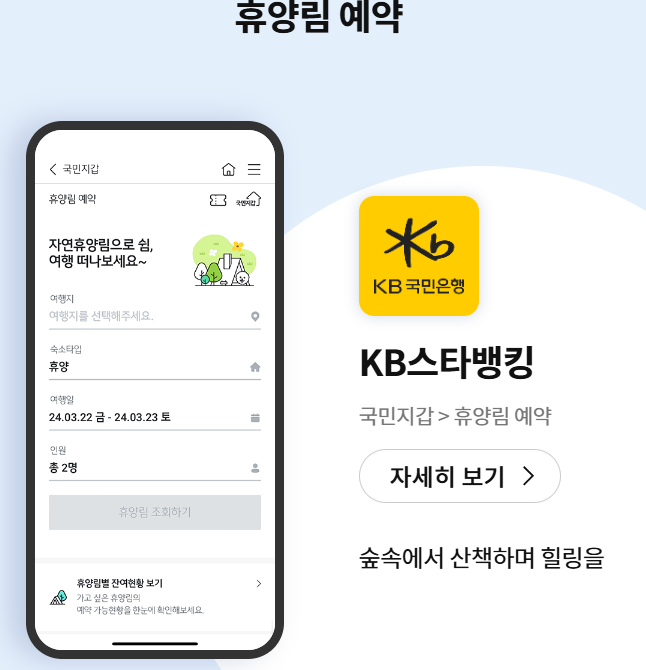 정보동의 후 휴양림 예약을 KB스타뱅킹에서 이용 가능합니다.