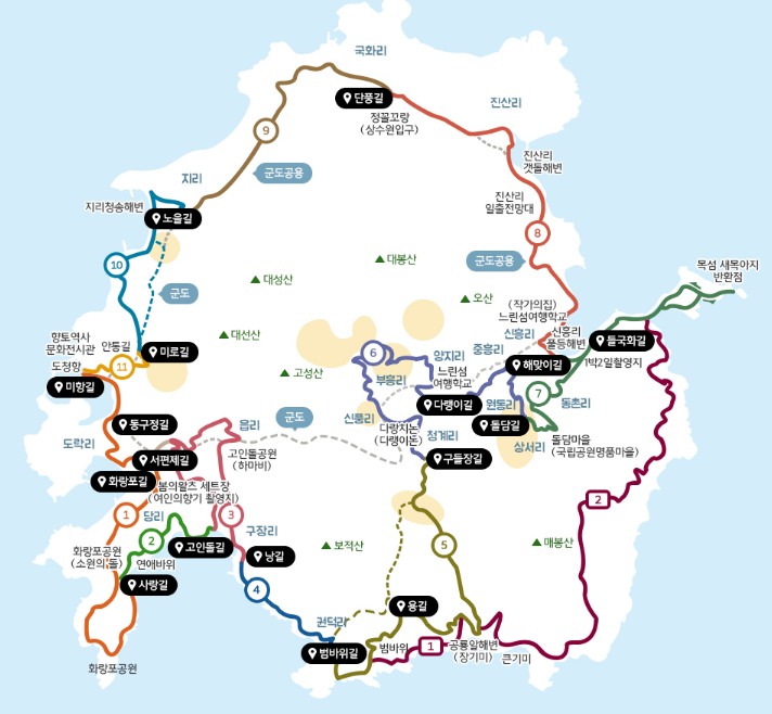 섬 전체를 도보 여행으로 즐길 수 있도록 조성된 길로 코스는 총 11개입니다.
